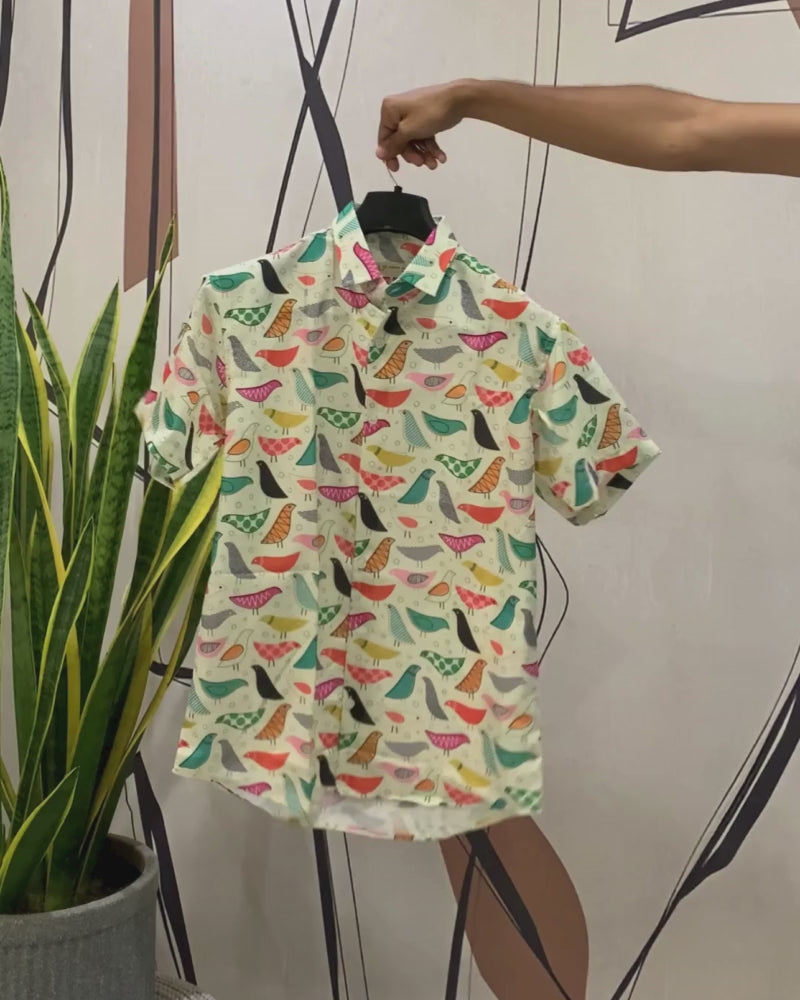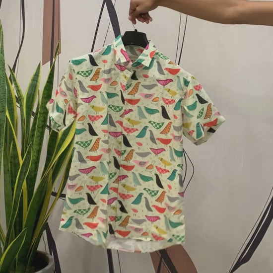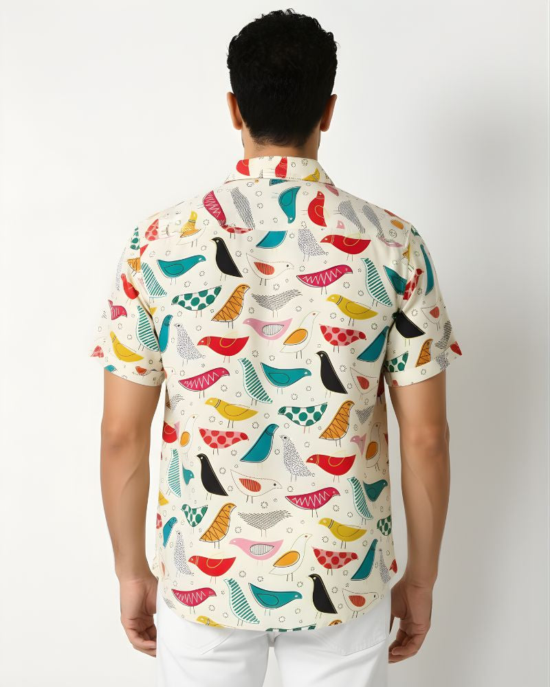 Shirt Description: Half-Sleeve shirt with colourful birds patterns over cream background