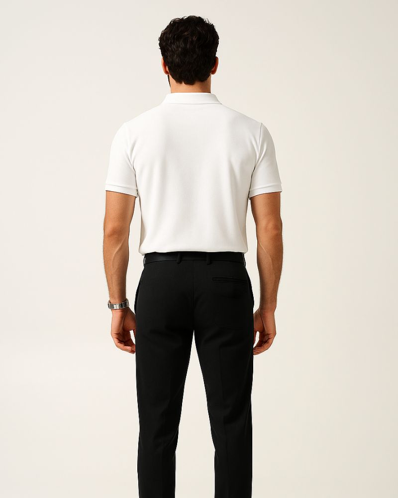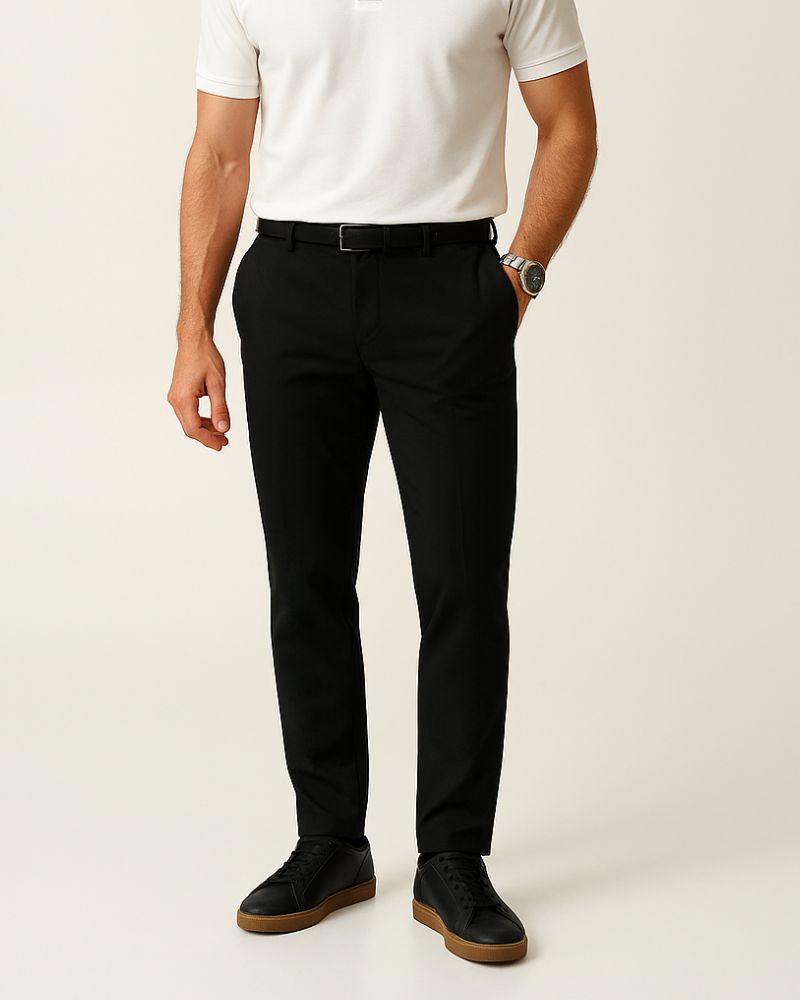 Slim-fit black colour stretch pants. Looks trendy and feels comfortable.