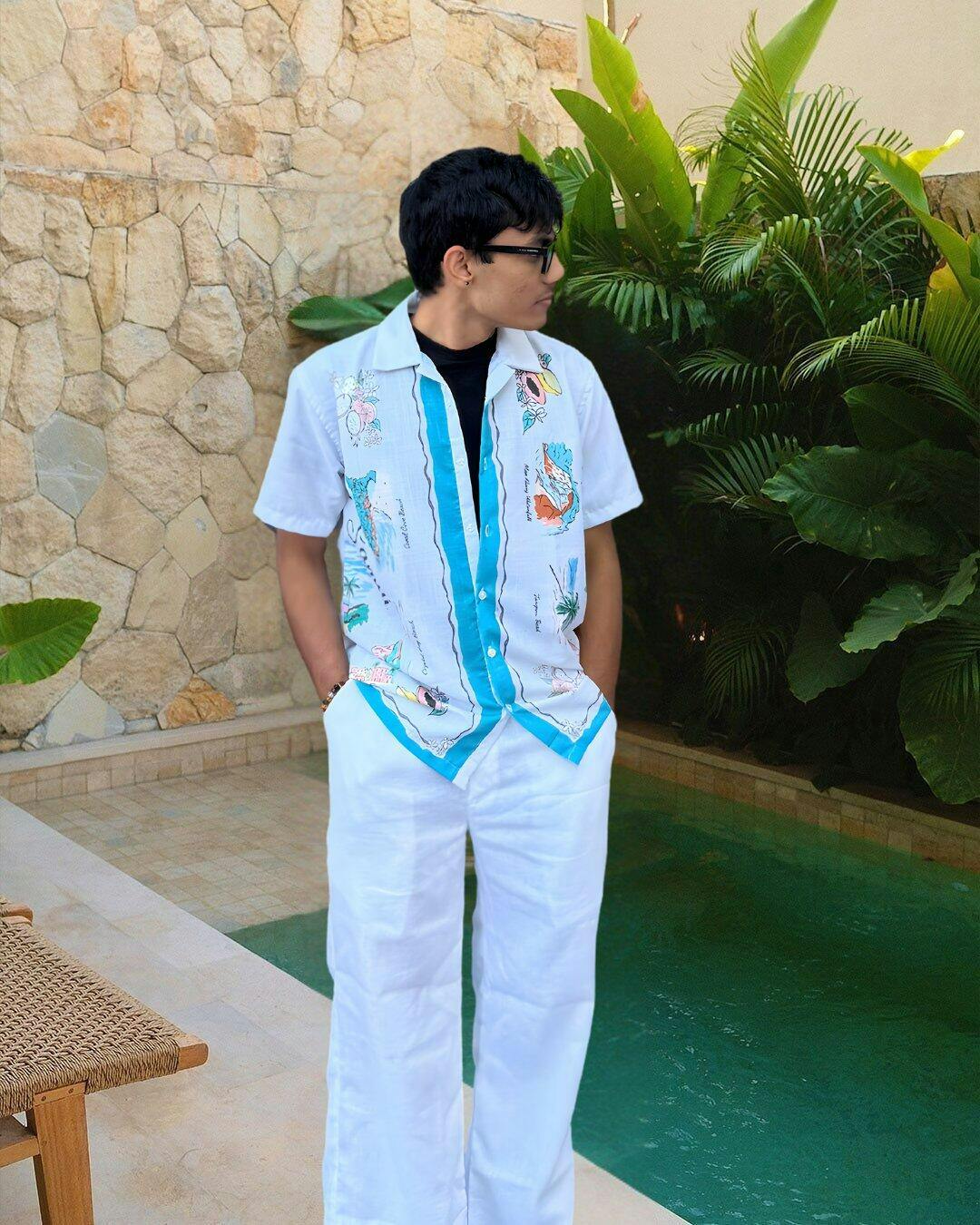 Shirt Description: Add a pop of fun and personality to your wardrobe with this colorful ocean prints over beige background shirt.