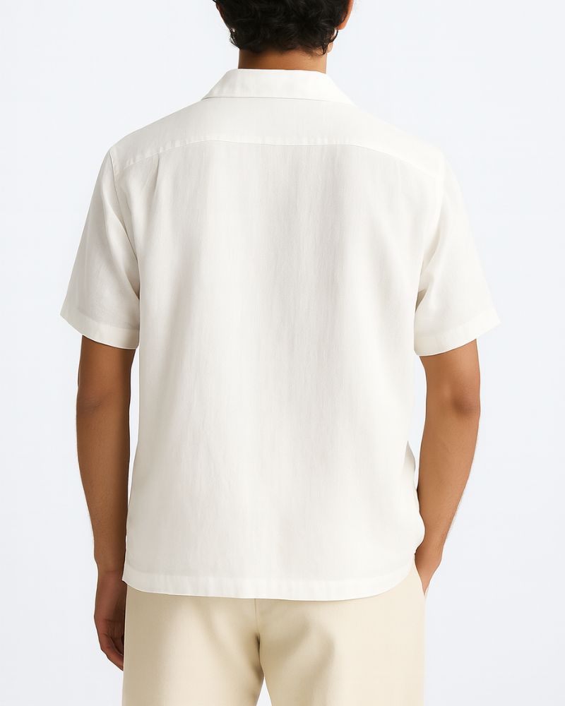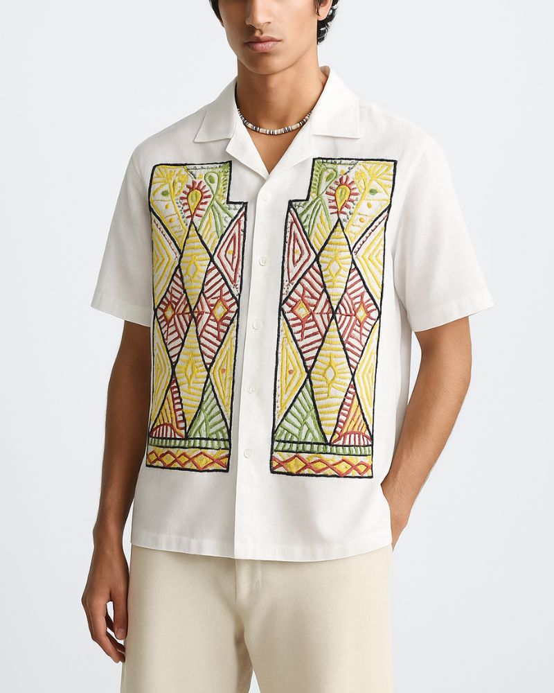 Cuban shirt with colorful tribal art prints over white background. Looks trendy and feels comfortable.
