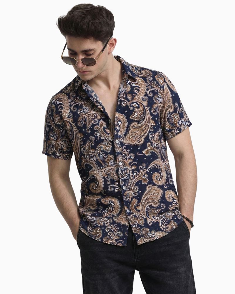 Shirt Description: Half-sleeves shirt with ethnic motifs print over violet background. Perfect for outdoor casual wear. Soft fabric for optimum comfort.