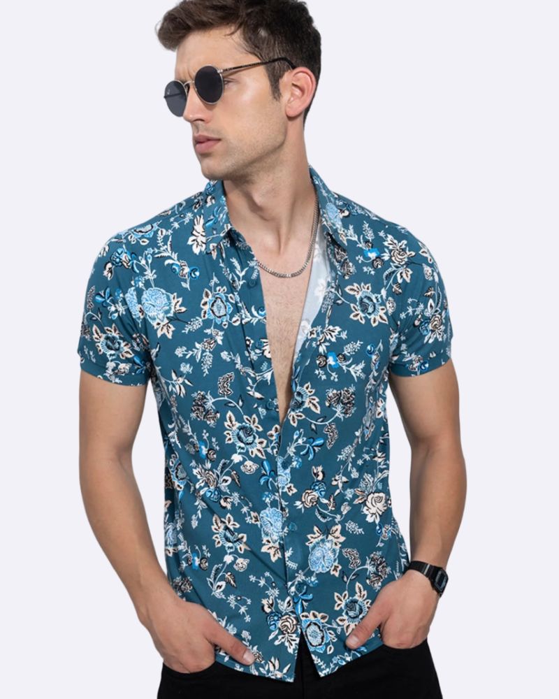 Shirt Description: Half-Sleeve shirt with floral prints over blue background