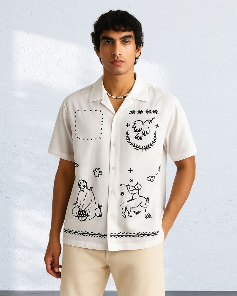 Cuban shirt with unique graphics prints over white background. Looks trendy and feels comfortable.