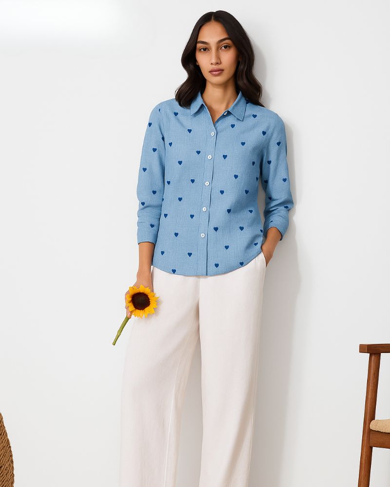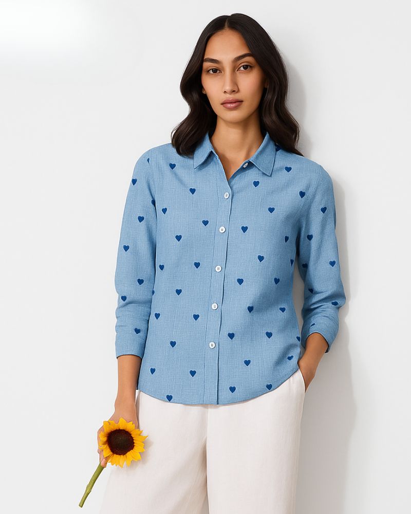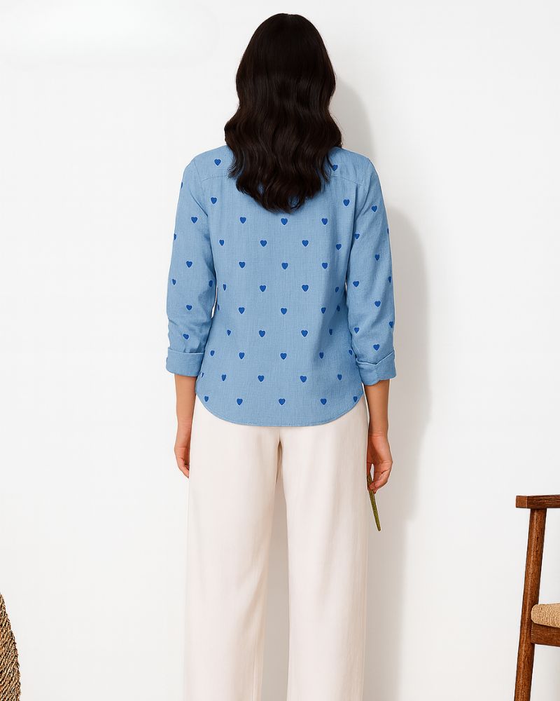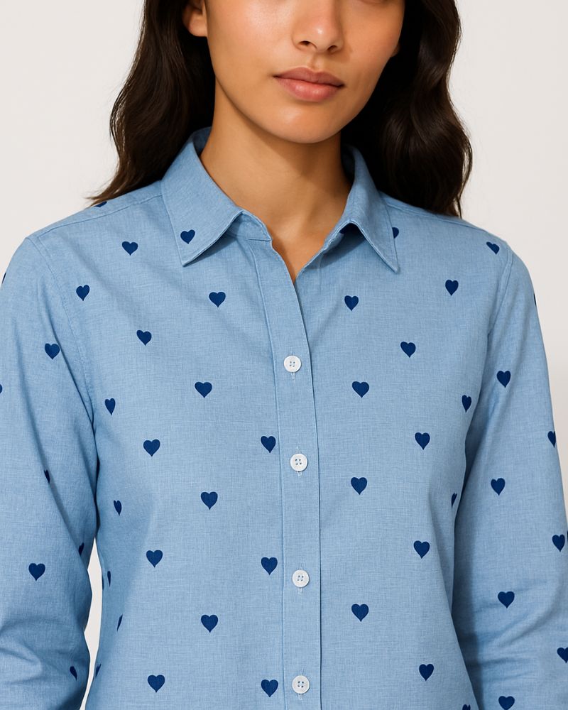 Shirt Description: Add a pop of fun and personality to your wardrobe with this sky blue shirt having small heart shaped prints.