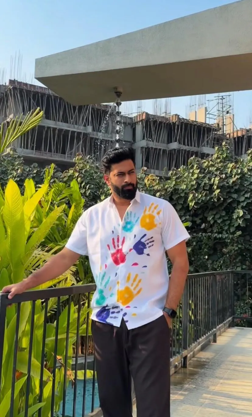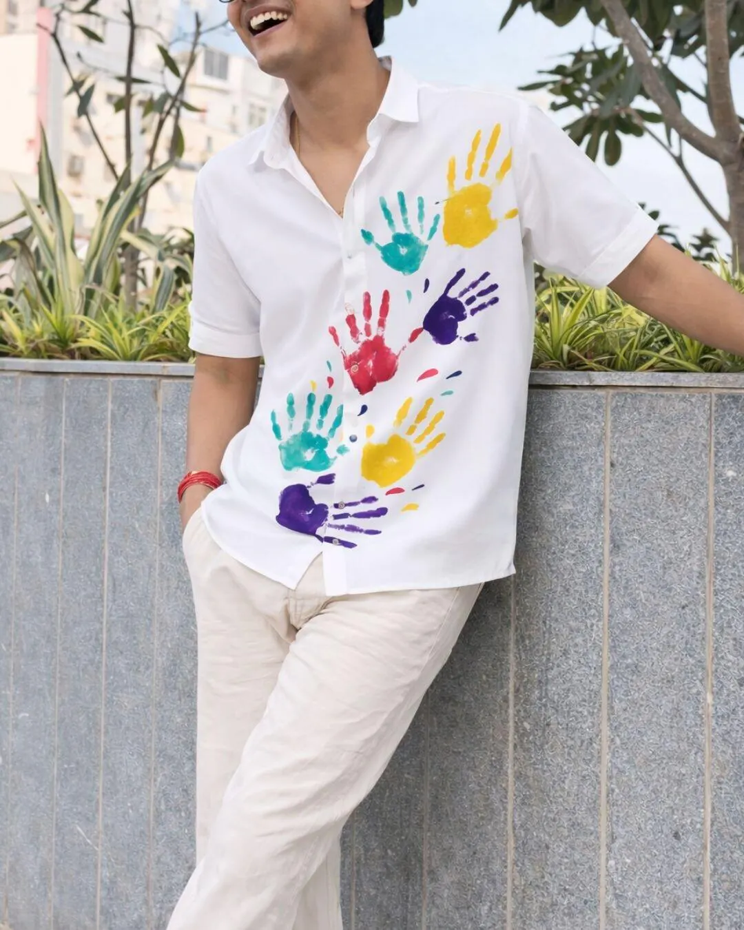 Shirt Description: Half-Sleeve shirt with holi handprints over white background. Best for outdoor casual wear. Soft fabric for optimum comfort.