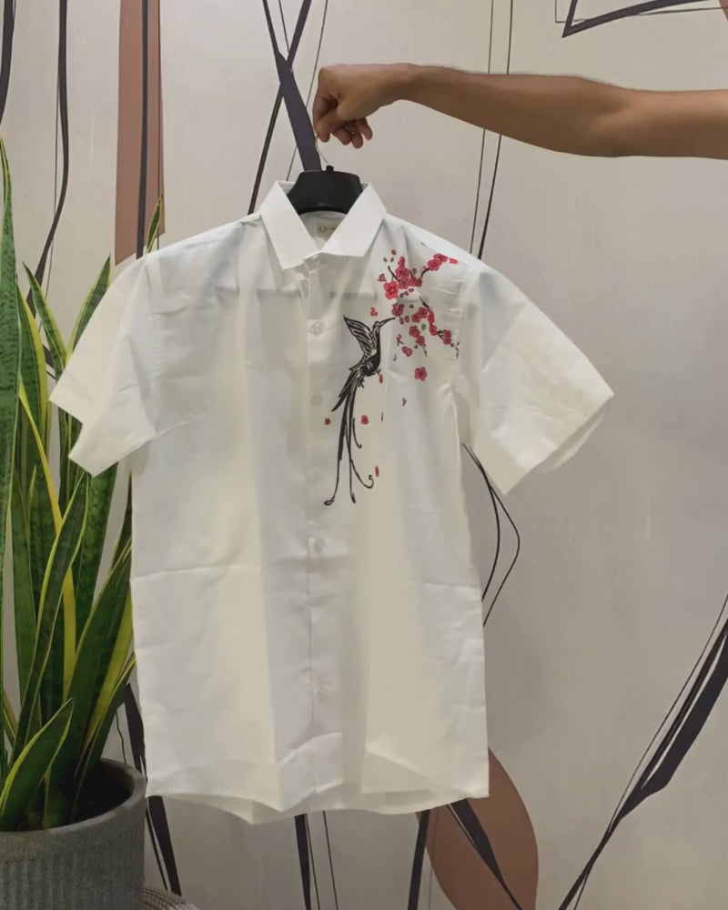 ShirtΒ Description: Half-Sleeve shirt with hummingbird print on white background