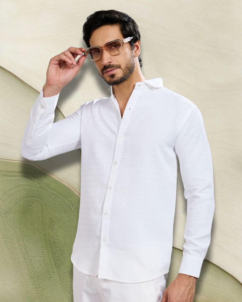 Full-sleeve white casual shirt made from premium material, perfect for winter season. Looks trendy and feels comfortable.