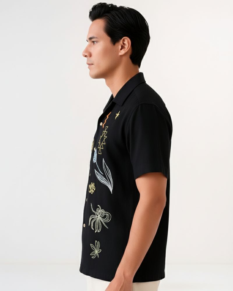 Shirt Description: Add a pop of fun and personality to your wardrobe with this colorful ocean art prints over black background shirt.