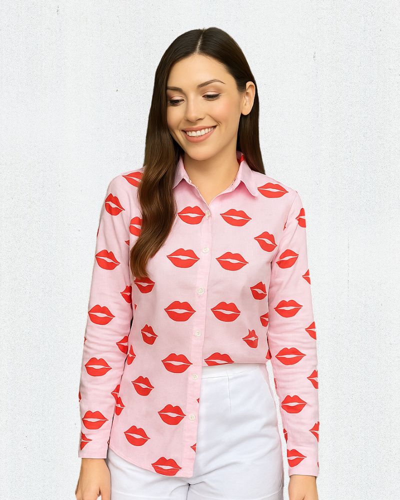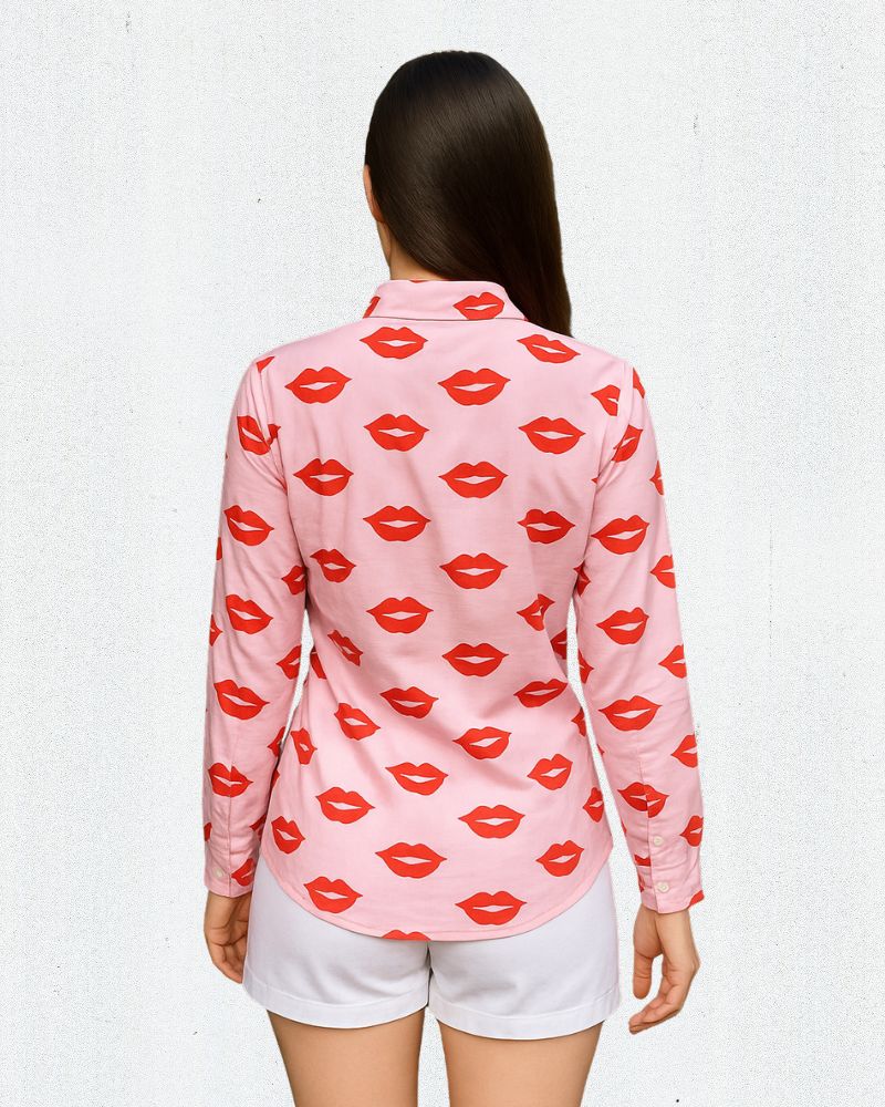Shirt Description: Add a pop of fun and personality to your wardrobe with this pink shirt having bold lips prints.