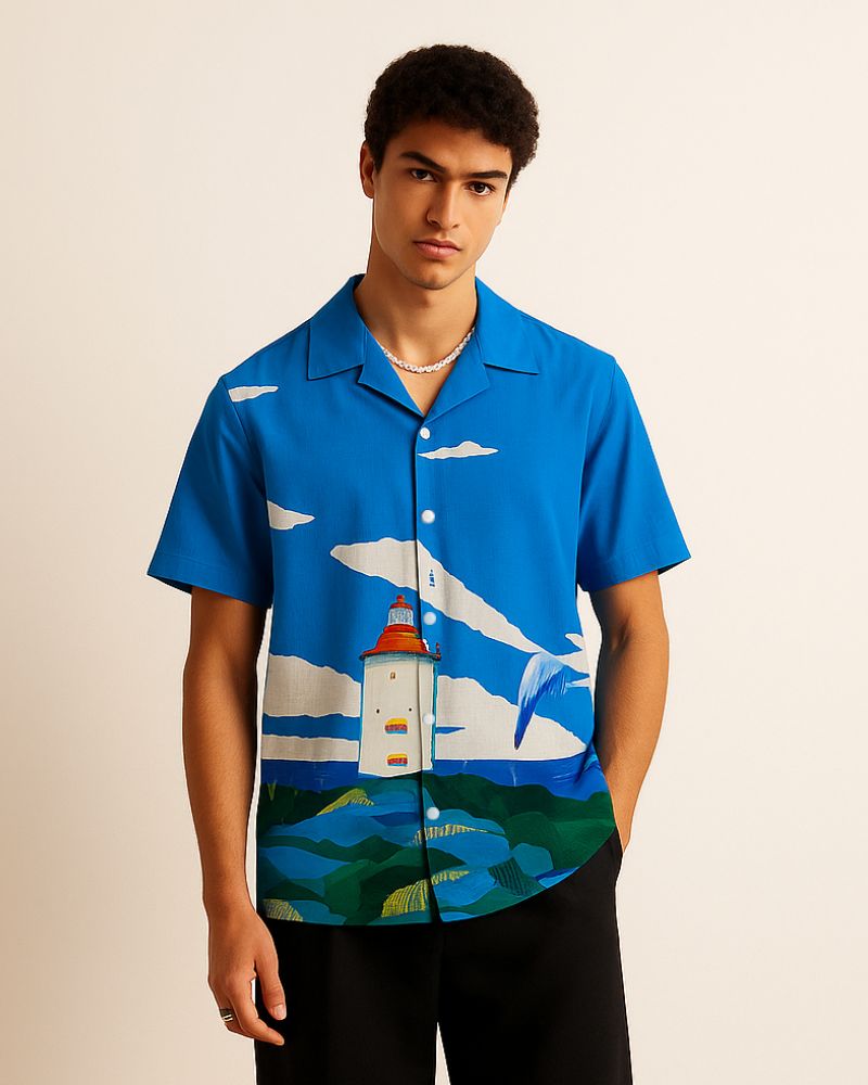 Blue cuban shirt with scenic lighthouse & ocean beach graphics prints . Looks trendy and feels comfortable.