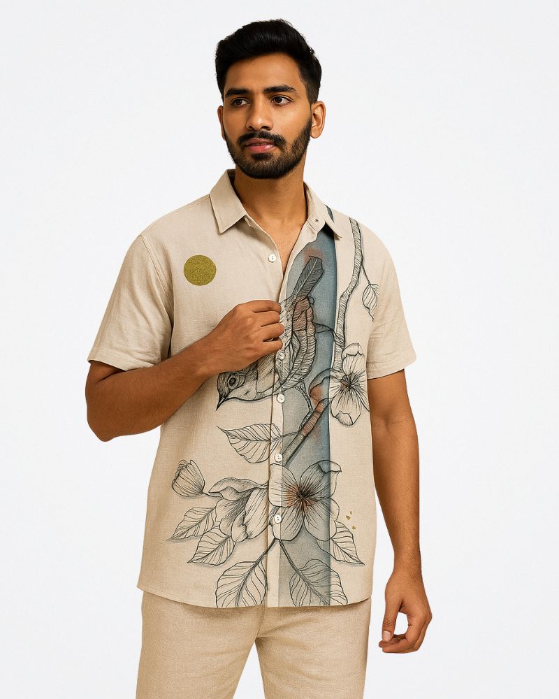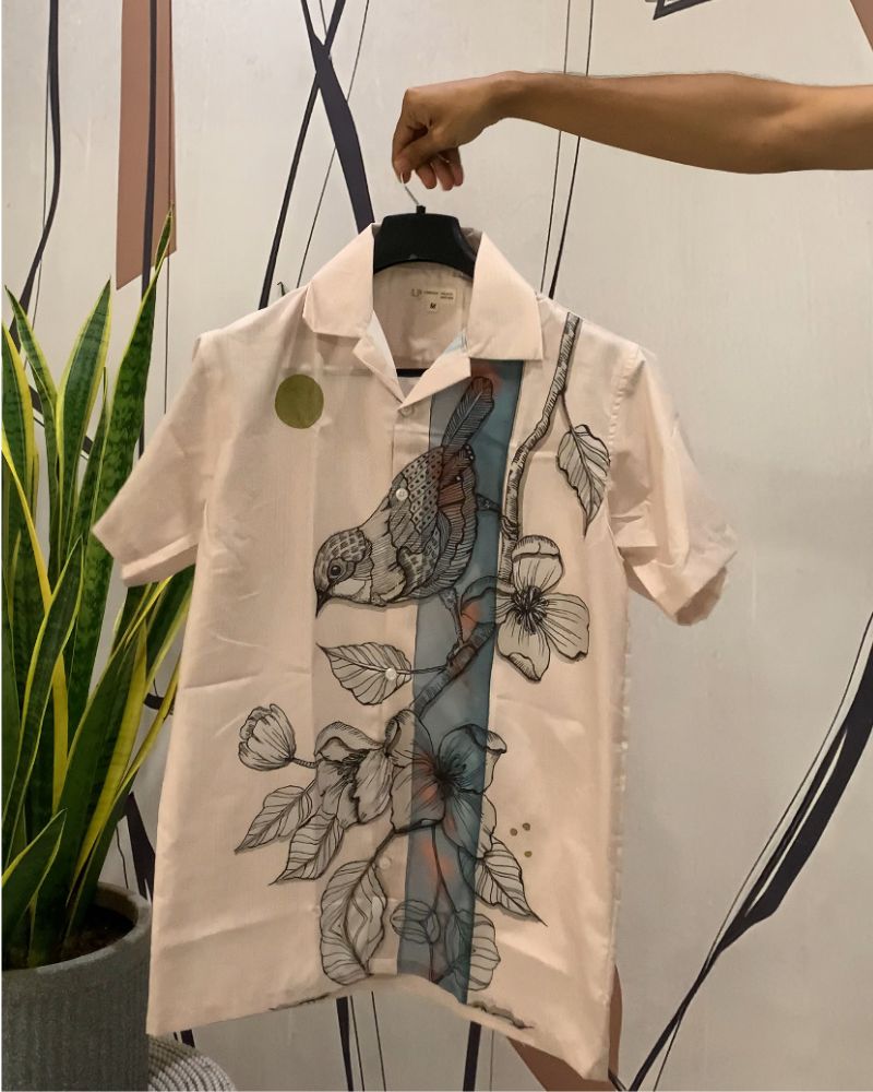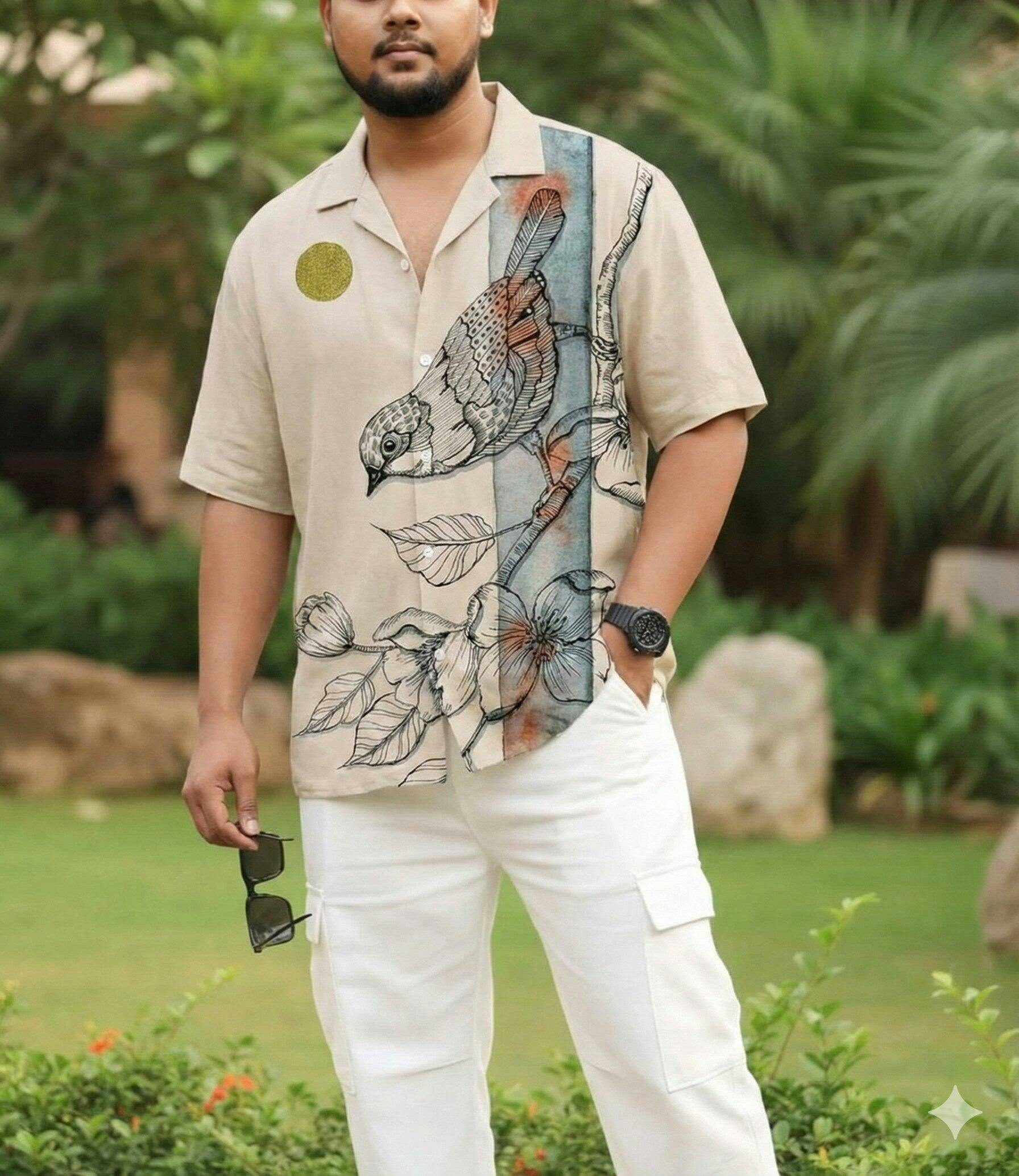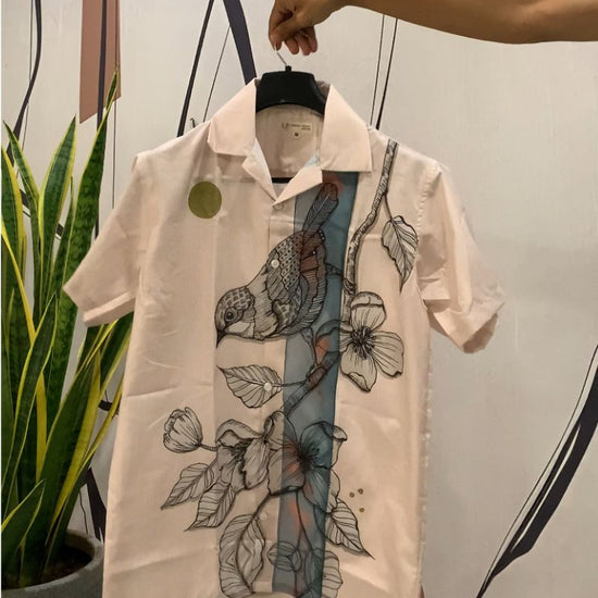 Shirt Description: Half-sleeves white shirt with print of bird enjoying the flower nectars. Perfect for outdoor casual wear. Soft fabric for optimum comfort.