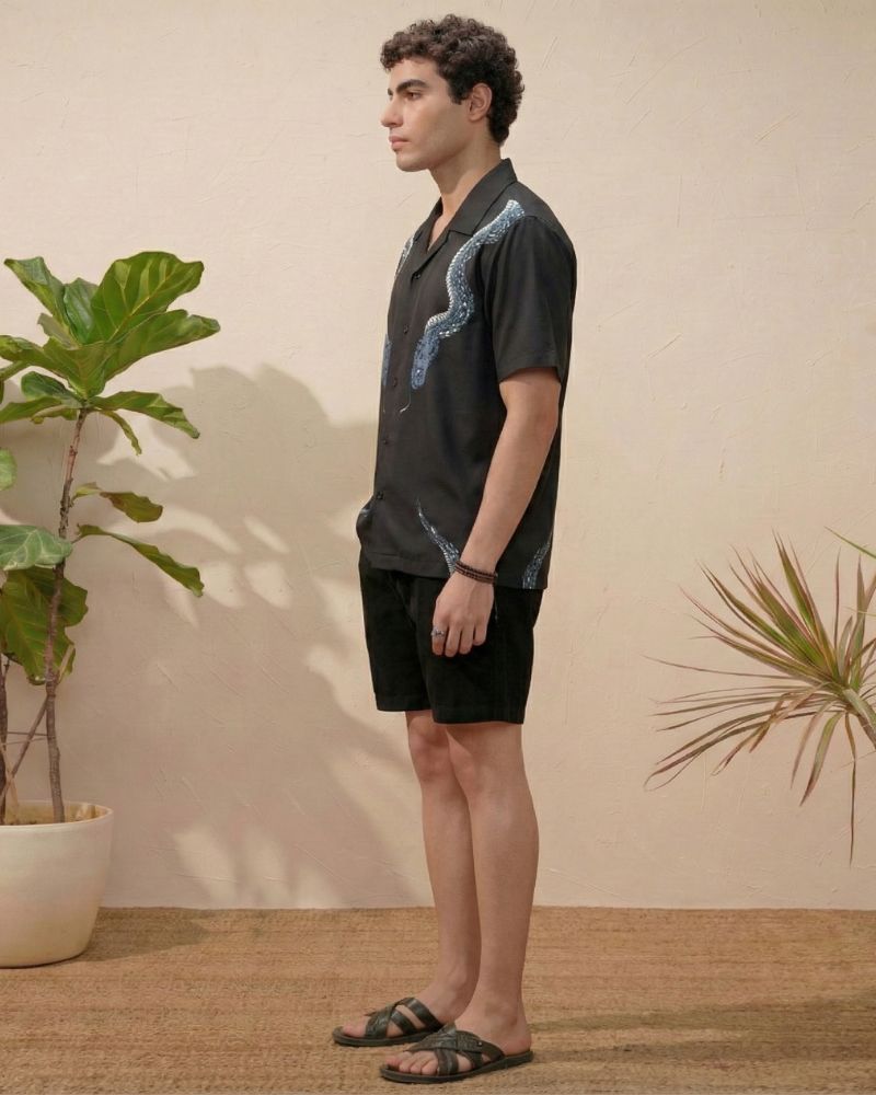 Shirt Description: Add a pop of fun and personality to your wardrobe with this unique printed shirt, having twin vipers print over dark background.