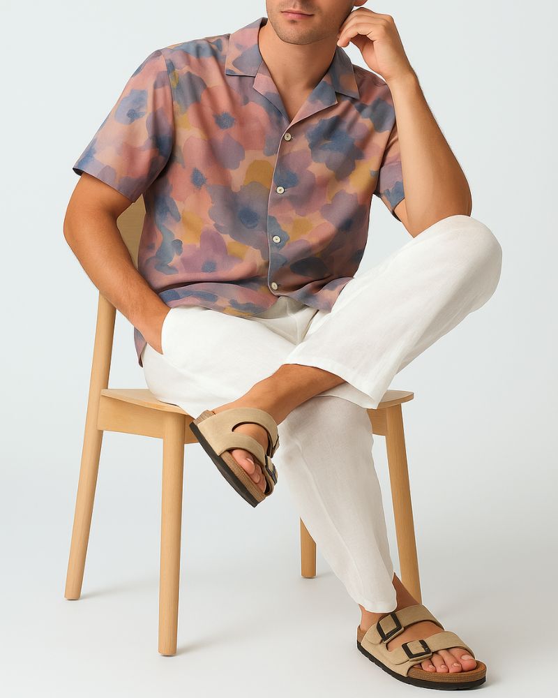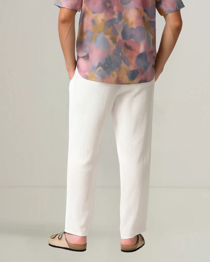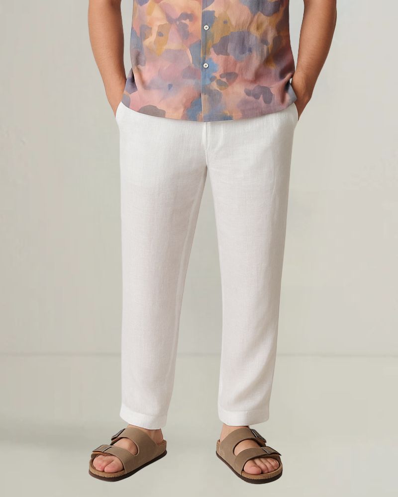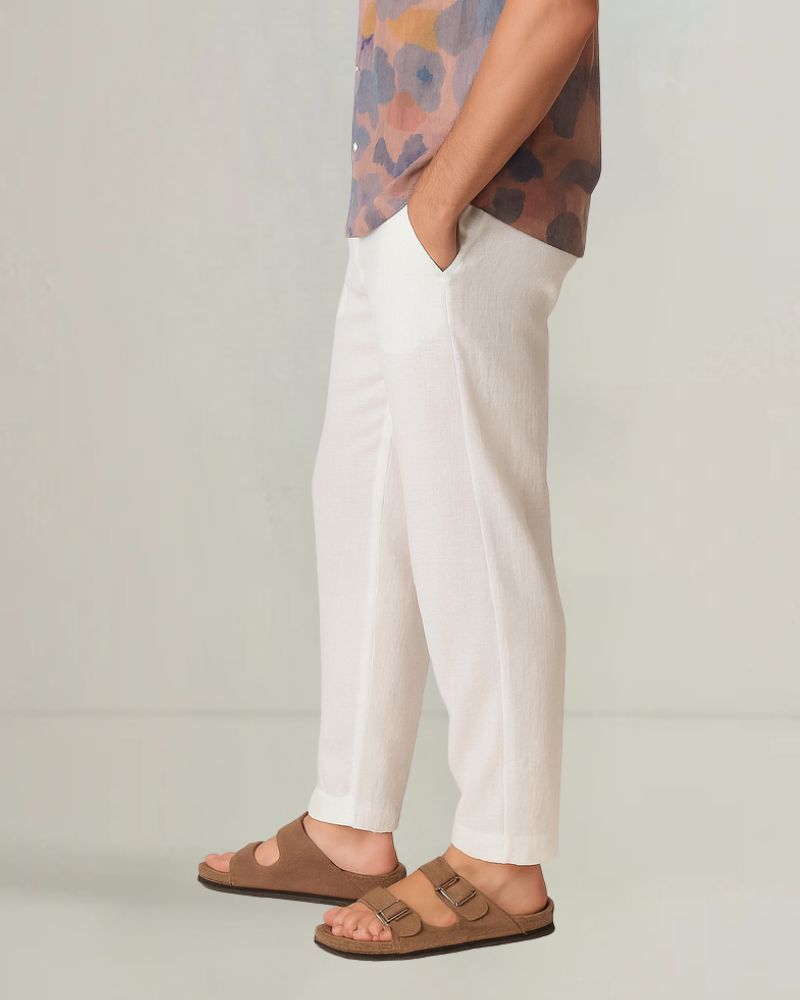 Relaxed-fit white linen pant. Looks trendy and feels comfortable.